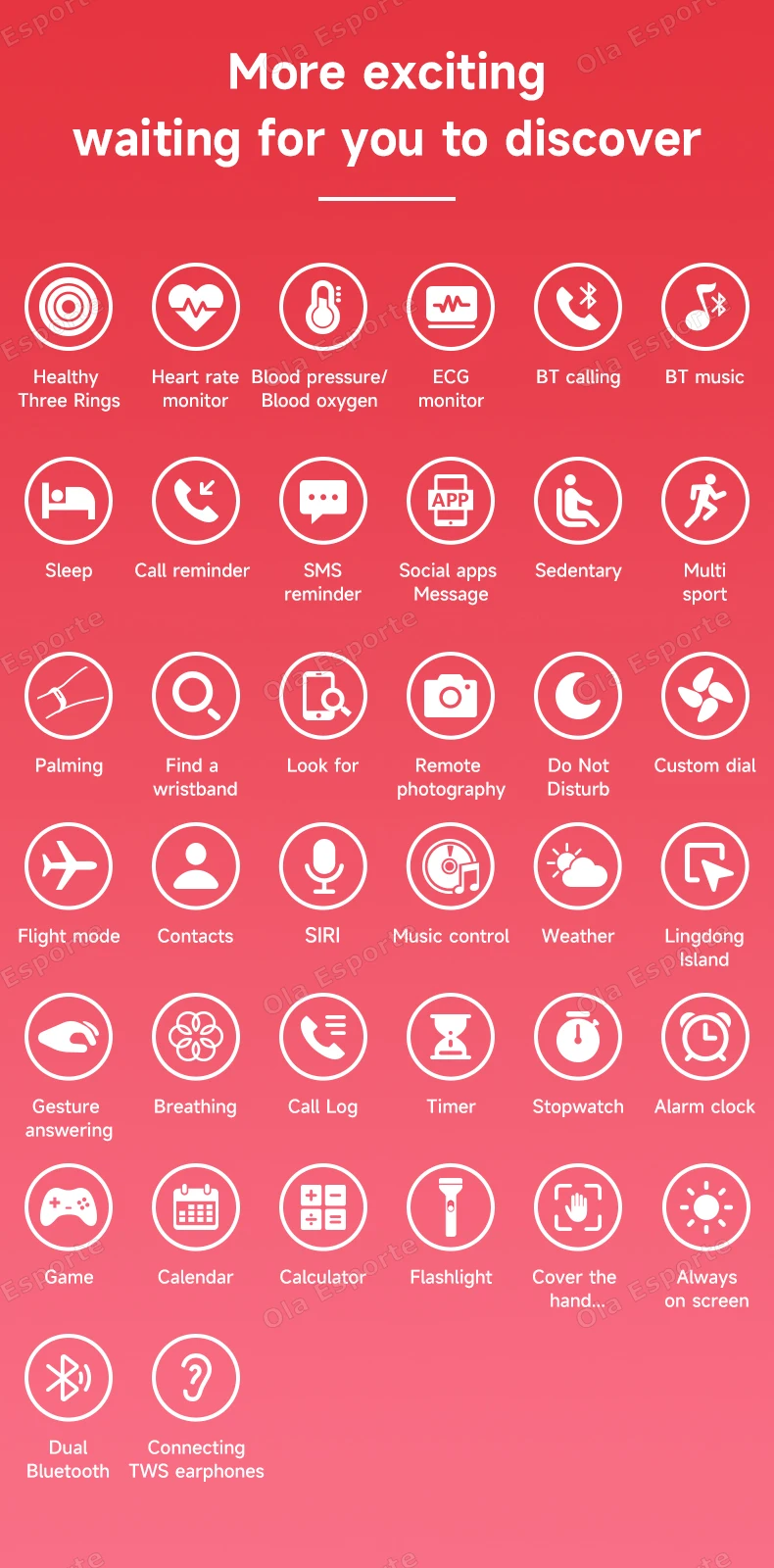 NPC step、distance、Calorie、Heart Rate/Blood Pressure/Oxygen 、BT call、BT Music、Temperature、Monitoring、Sleep monitoring、call reminder、SMS Alerts、Social APP Message Reminder、Alarm clock reminder、A sedentary reminder、sport、Turn the wrist and shine the screen、Looking for bracelets、Looking for Phones、Remote Photography、Rejection of calls、Do Not Disturb、Multi-dial switching.