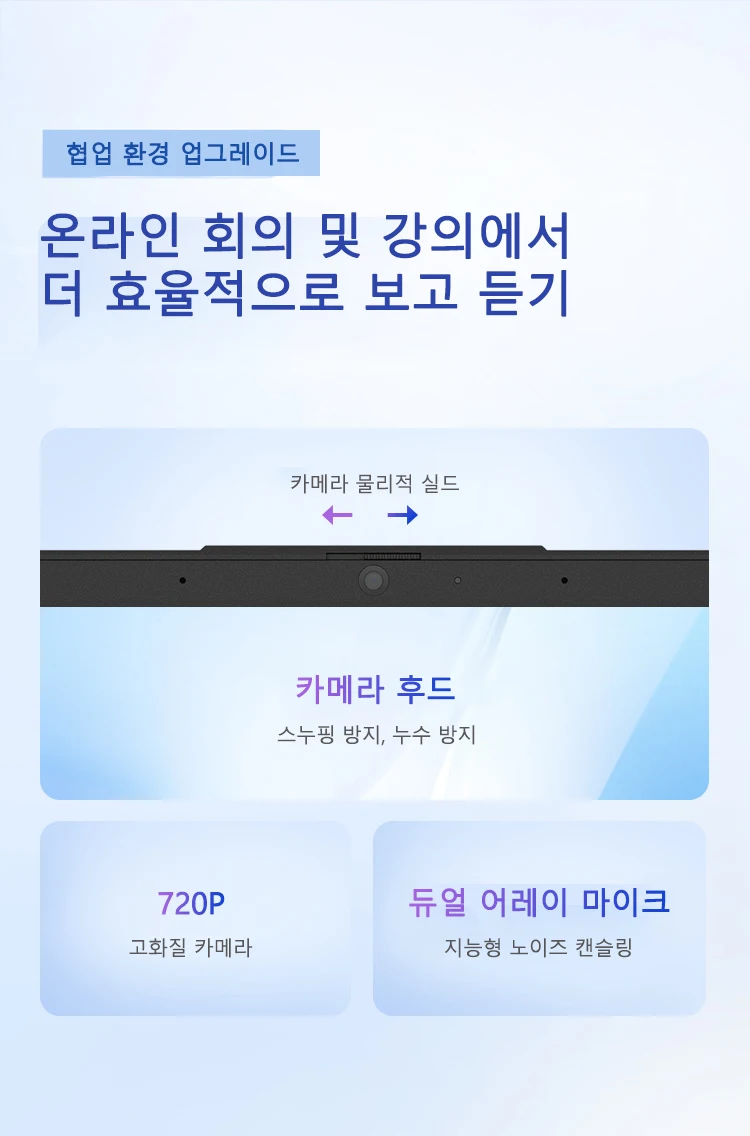 702P 고화질 카메라, 이중 배열 마이크와 결합되어, 또한 물리적 개인 정보 보호 패들과 표준으로 제공됩니다